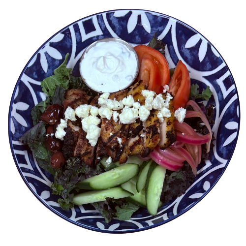 Grilled lemon chicken thighs over shredded tuscan kale, sliced cucumber, tomato, kalamata olives, feta cheese, red onion & a tzatziki dressing or a dairy free lemon vinaigrette. GLUTEN FREE.